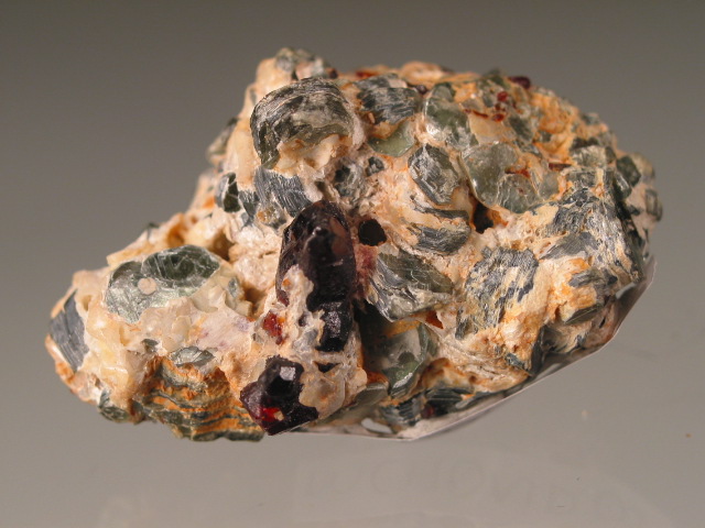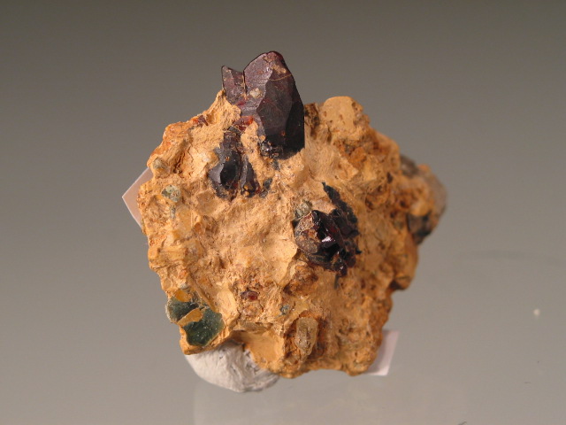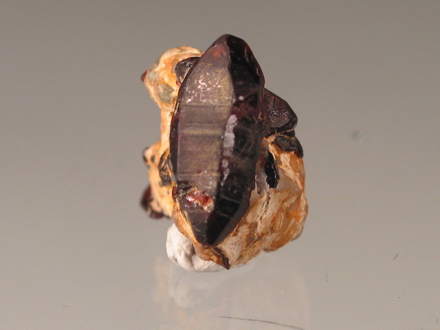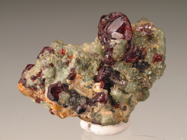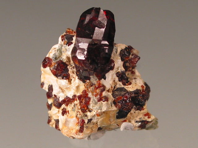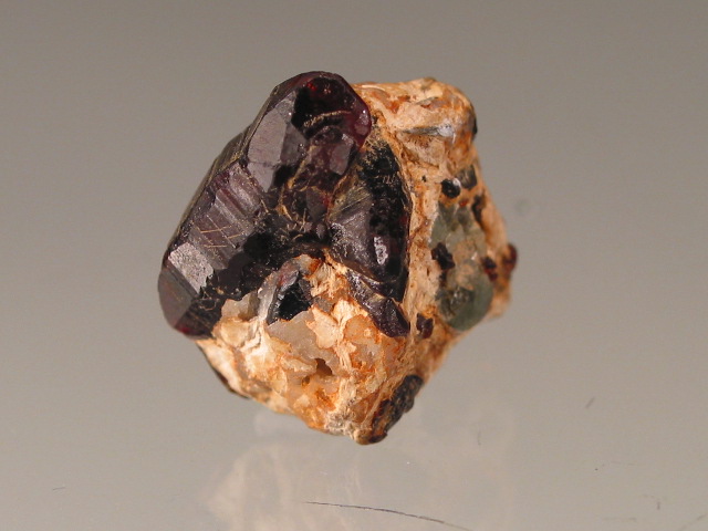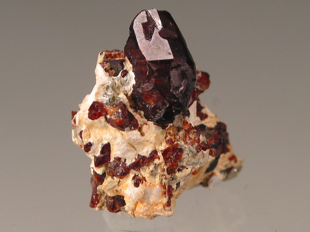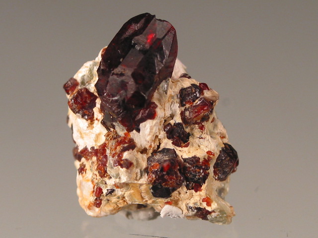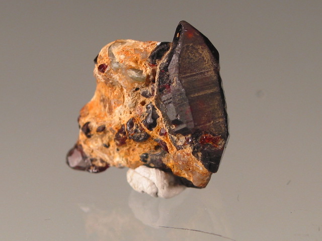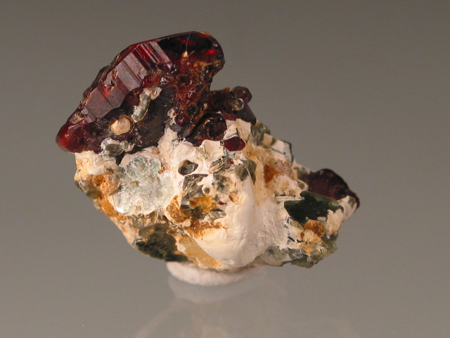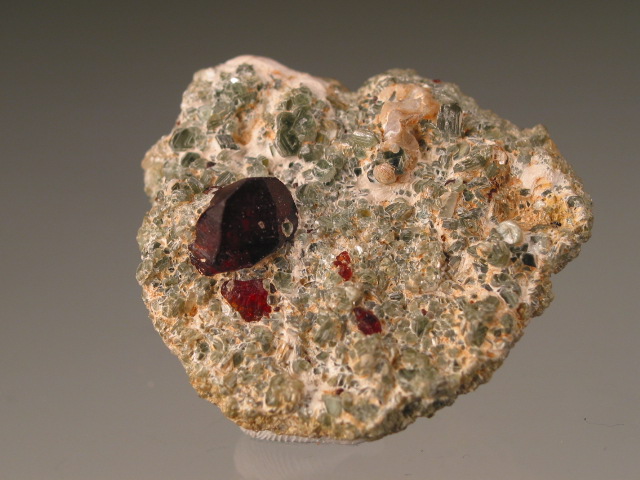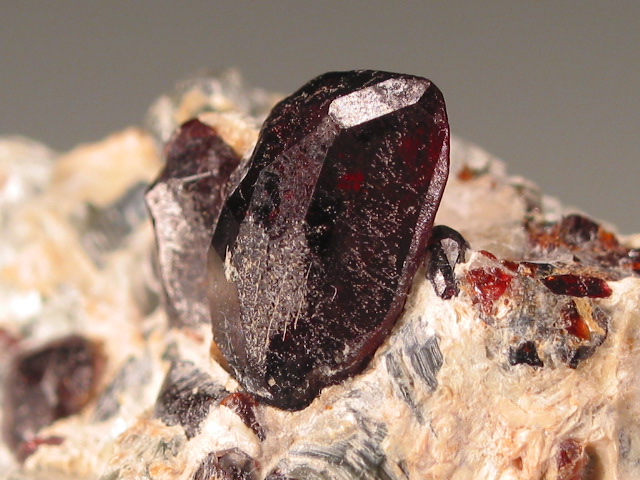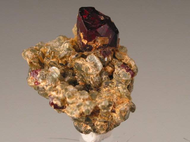 A choice thumbnail, with a large, deep red, gem Clinohumite crystal on a schist matrix.