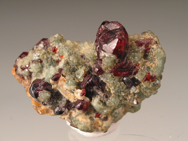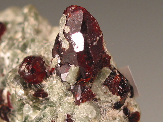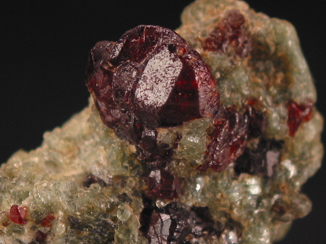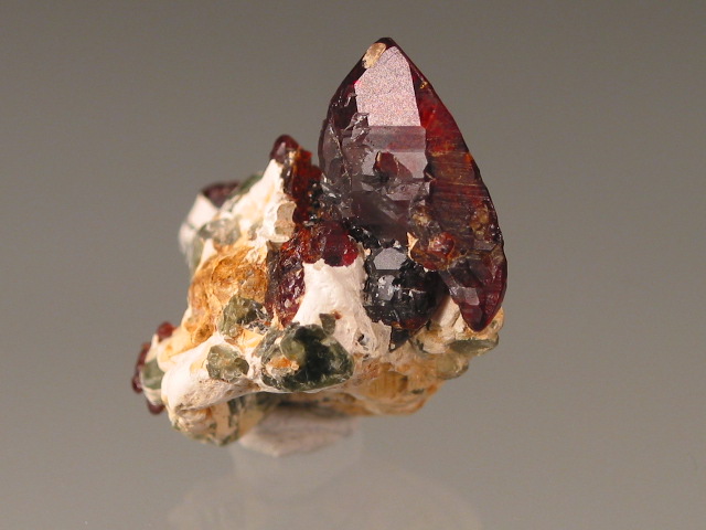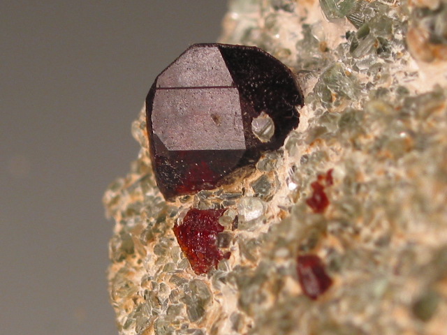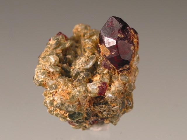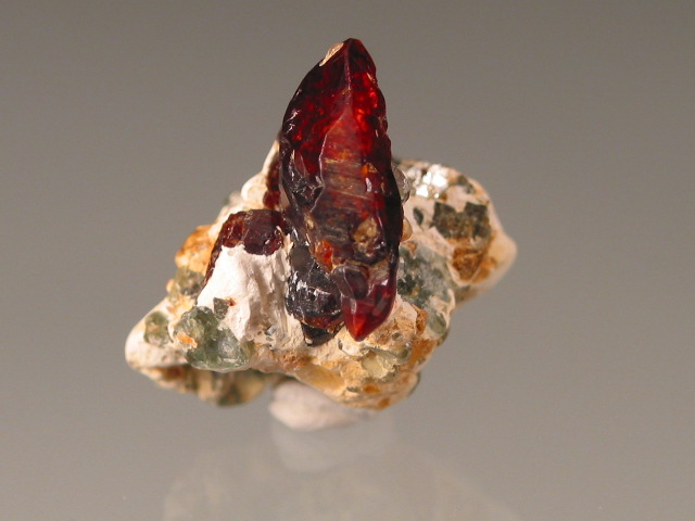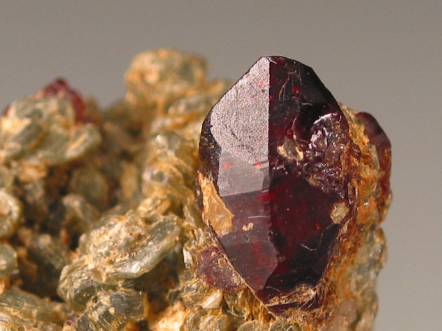 A perfectly terminated, deep red Clinohumite crystal on a green chlinochlore matrix.