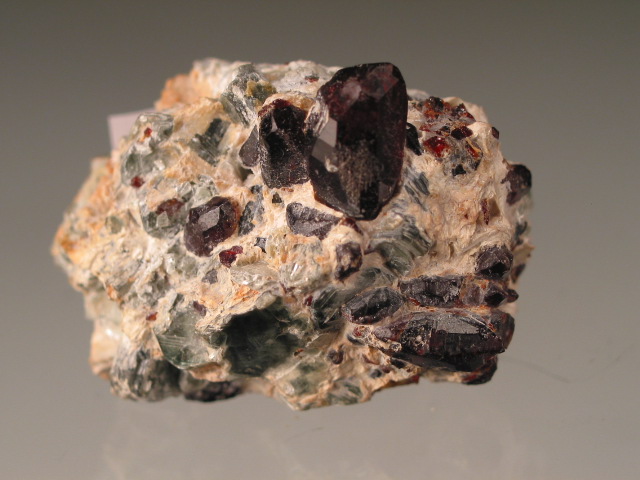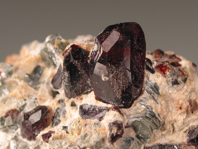 Numerous deep red, gem Clinohumite crystals on a chlinochlore matrix. Very rare, and undamaged.