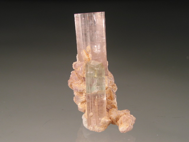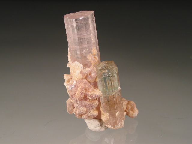 perched next to a gemmy bicolor elbaite, both on a lepidolite/albite